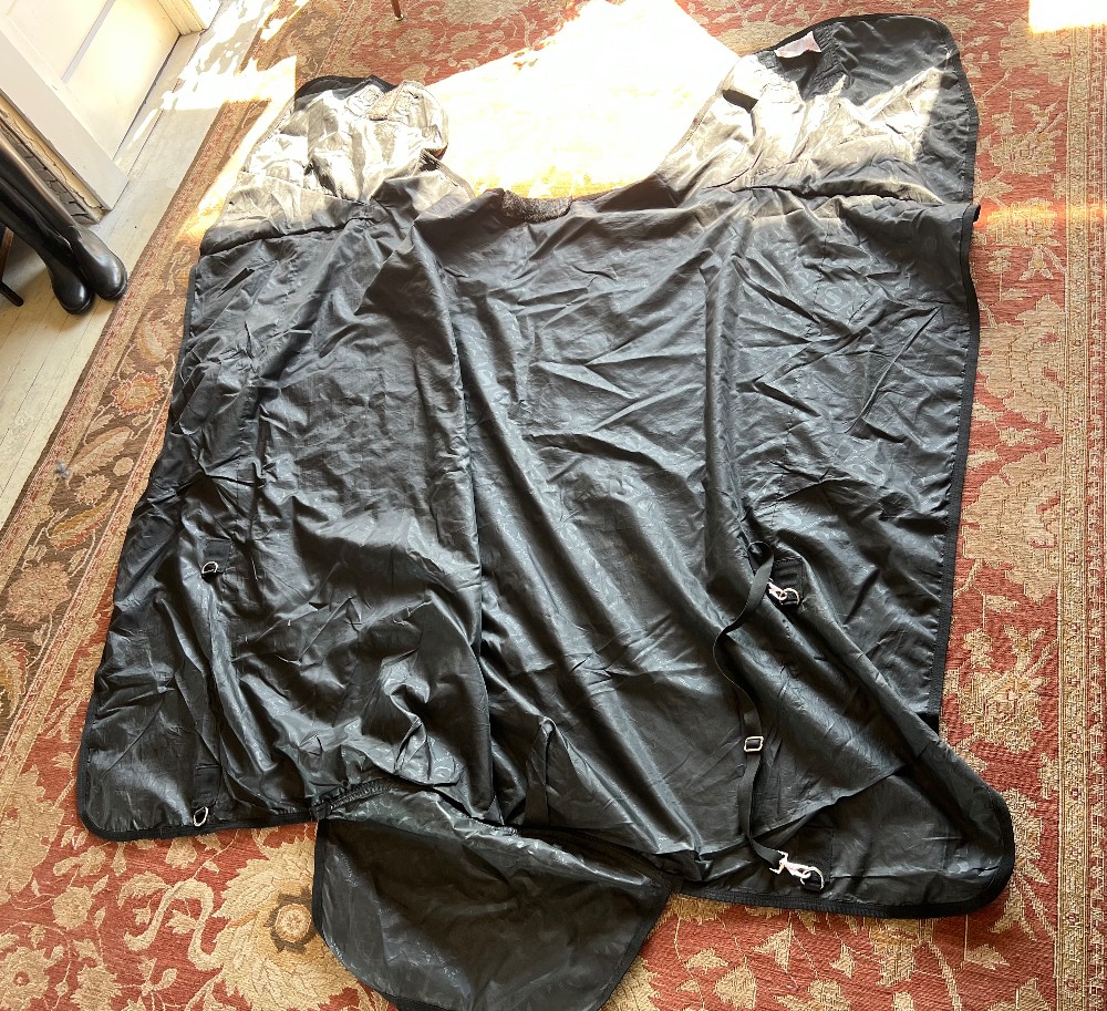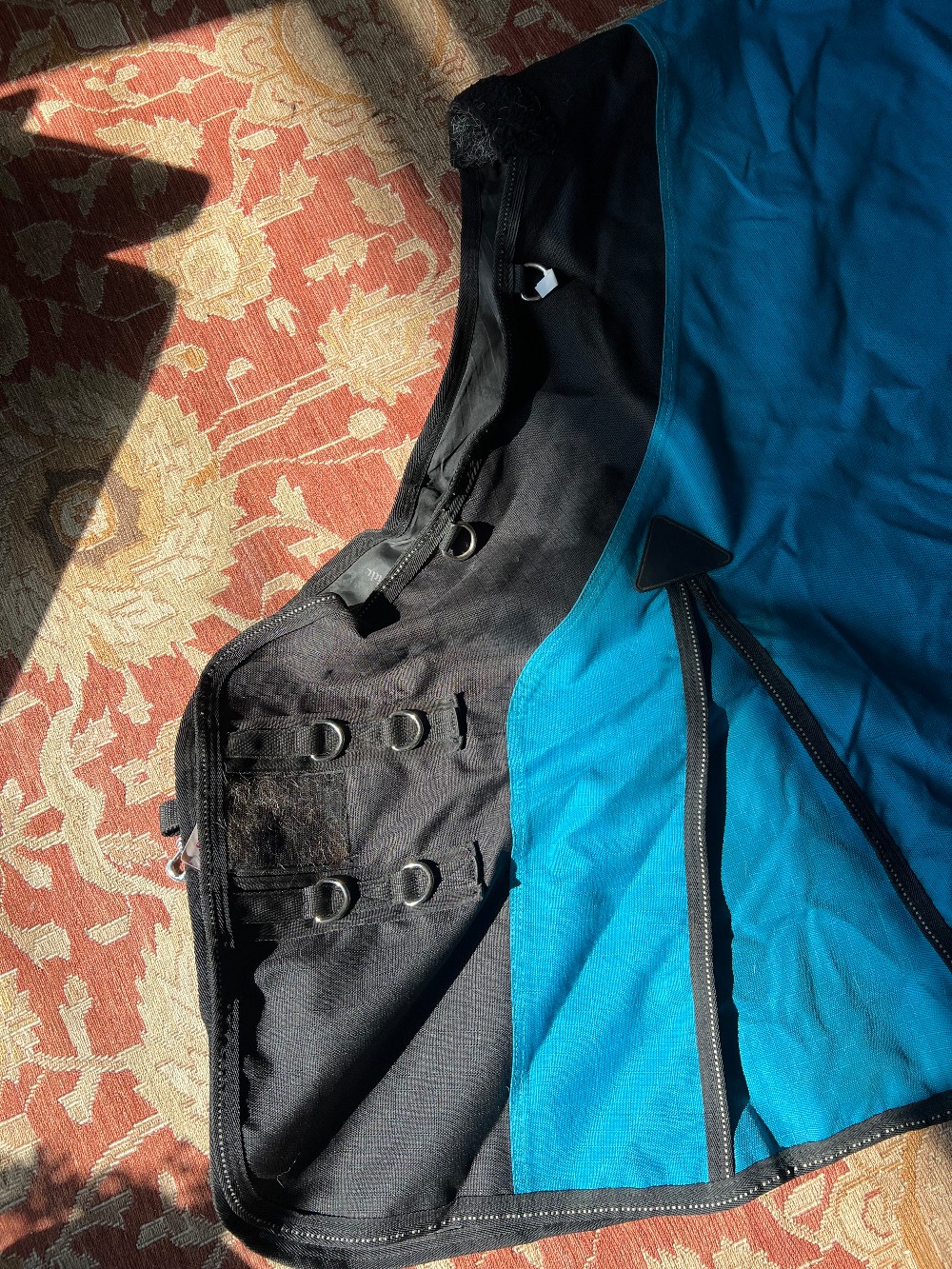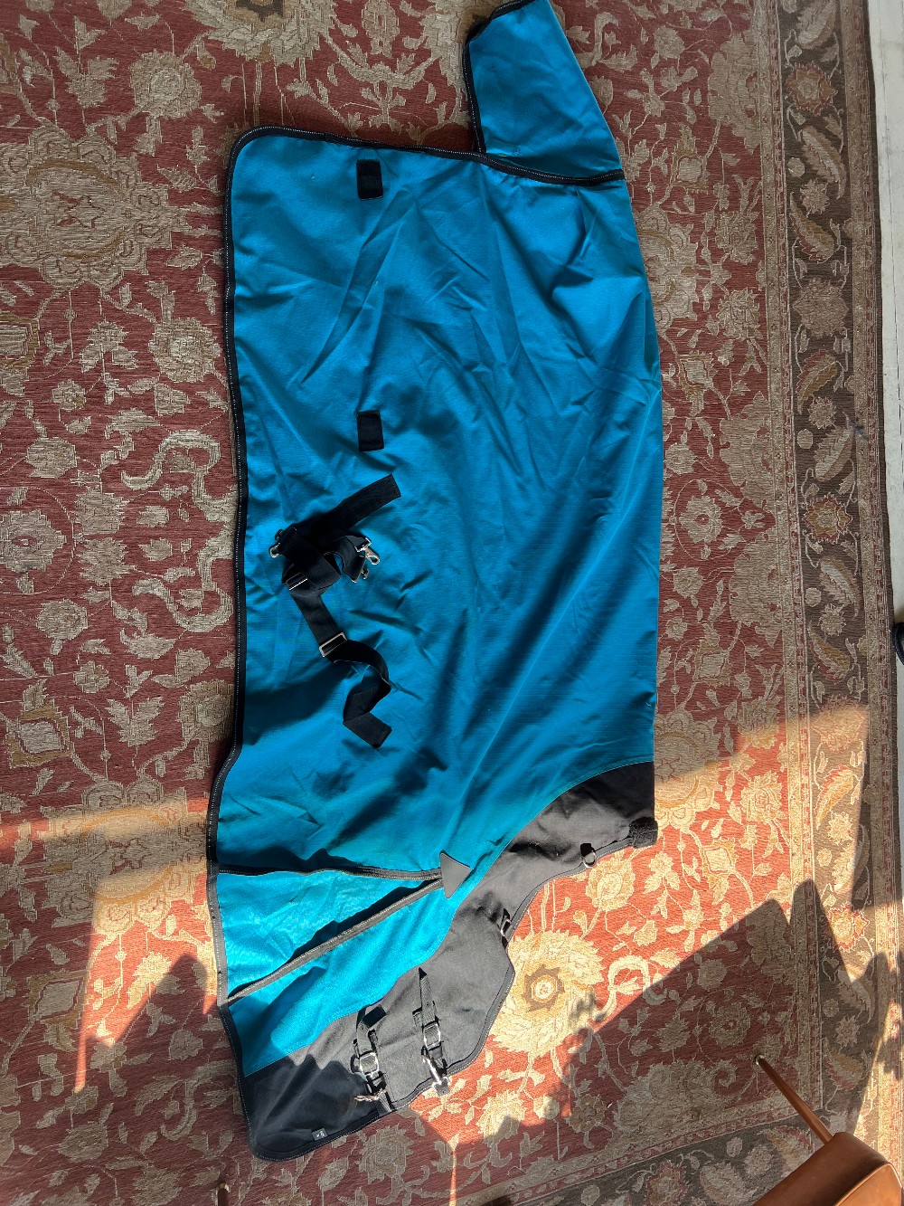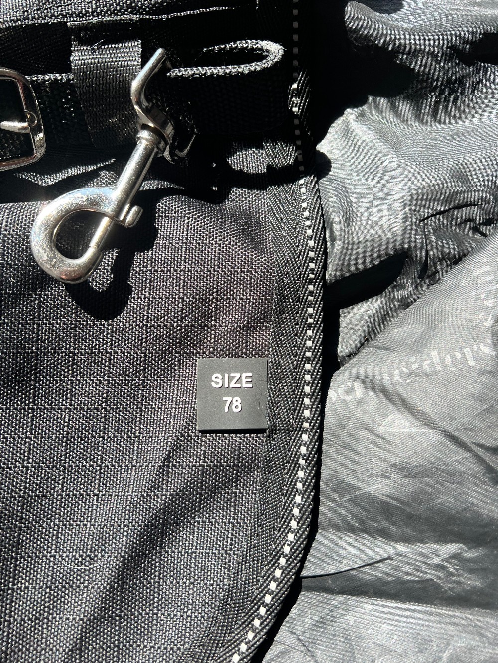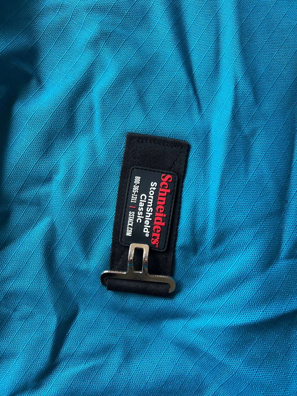 78" Schneiders Stormshield Blanket w/ Surcingle Closure.Condition: Used, Good aside for some small holes.