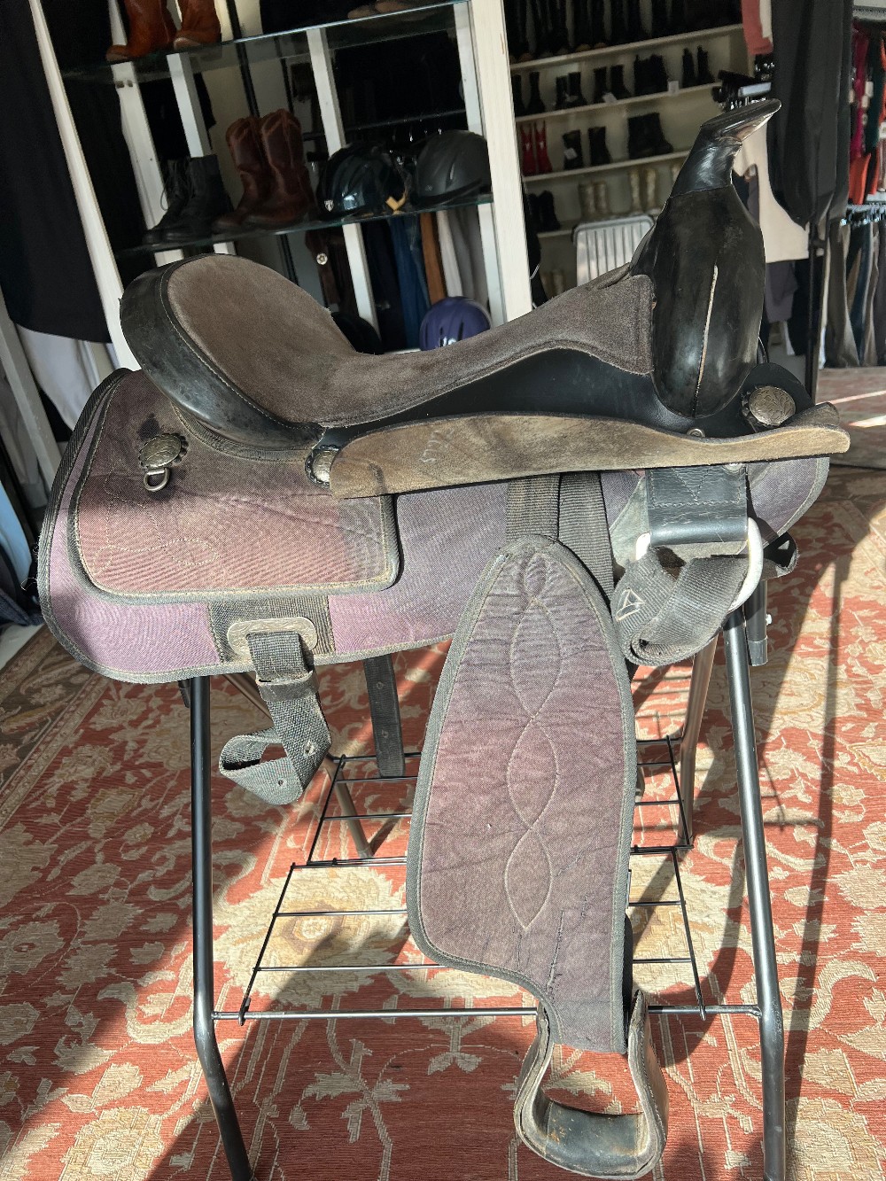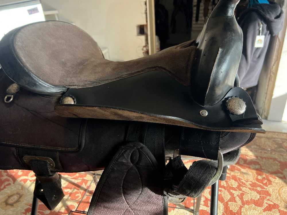 This saddle is suited for a smaller horse and smaller person.